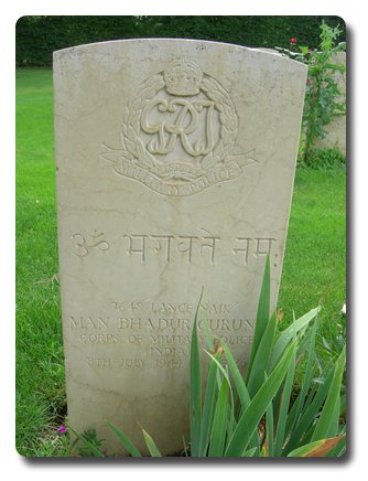 | Notes: | CMP(I). 6/7/44 S OF UMBERTO. ENEMY AIR RAID 2 PRO IOR (2 PROVOST INDIAN OTHER RANKS) NCO'S KILLED 2 M/C'S BLR'D (MOTOR CYCLES BEYOND LOCAL REPAIR) UNIT WAR DIARY WO 169/18827. DIED WITH L/NAIK BHUKAN SINGH. SHOWN AS DIED 6/7/1944 IN WAR DIARY AND 8/7/1944 IN CWGC ROLL. |