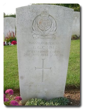 | Notes: | CMP/FSP. Enlisted in CMP transferred to Intelligence Corps. 21/7/1944 Died. Buried at Brouay War Cemetery, Calvados, France. Died at POW camp with 7 CMP of 53 Division Pro Coy. Casualty List 1525/13, North West Europe, Killed in action, Int Corps, 21/7/44. Medal card not found. Gerald George Coysgaine Sim. |