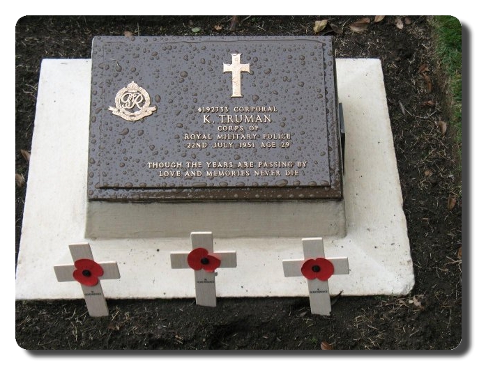 | Notes: | CMP/RMP. Died 22/7/1951. Formerly Royal Welch Fusiliers, transferred to CMP. Casualty List 1513/26 North West Europe, Wounded, 11/7/1944. Casualty List 1727/25, Western Europe, Wounded, 25/3/1945. 22/7/1951 cause of death non operational accident, Japan. Age 29. Grave Reference: Post War Plot B Row D Grave 1. Born 9/7/1922. Medal card not found. Kenneth Truman. |